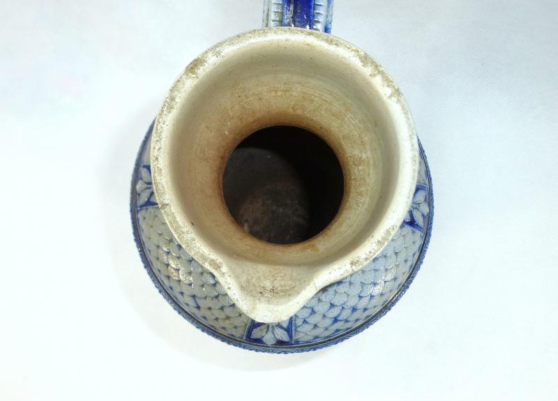 Großer Steingutkrug / Kanne, Deutsch, zweite Hälfte XIX Jh. Maße: ca. 34,5 x 19,5 x 15,5 cm. Durchmesser unten: ca. 10,3 cm. Gebrauchter Zustand, altersbedingte Gebrauchsspuren, am Fuss beschädigt (siehe Fotos)