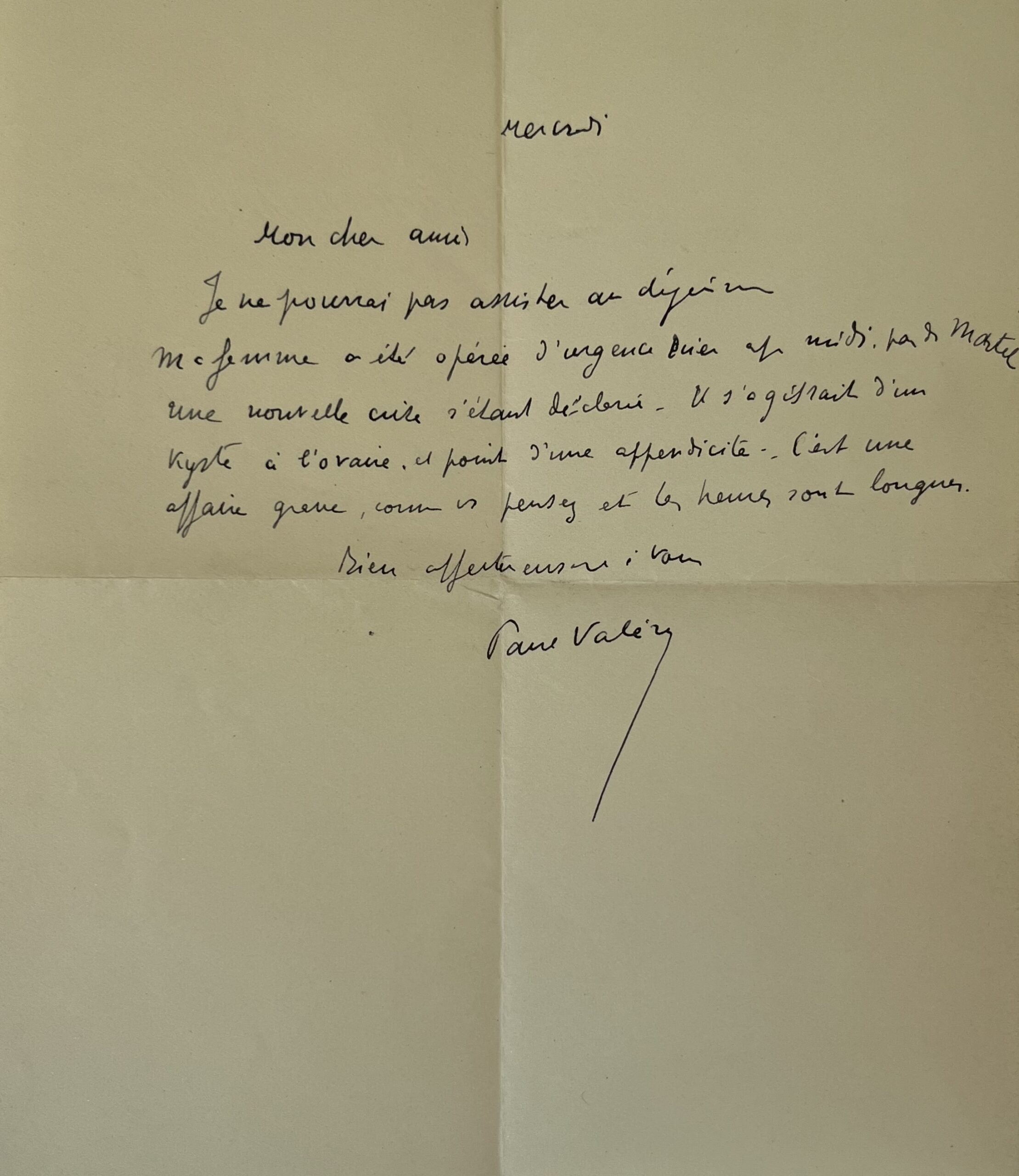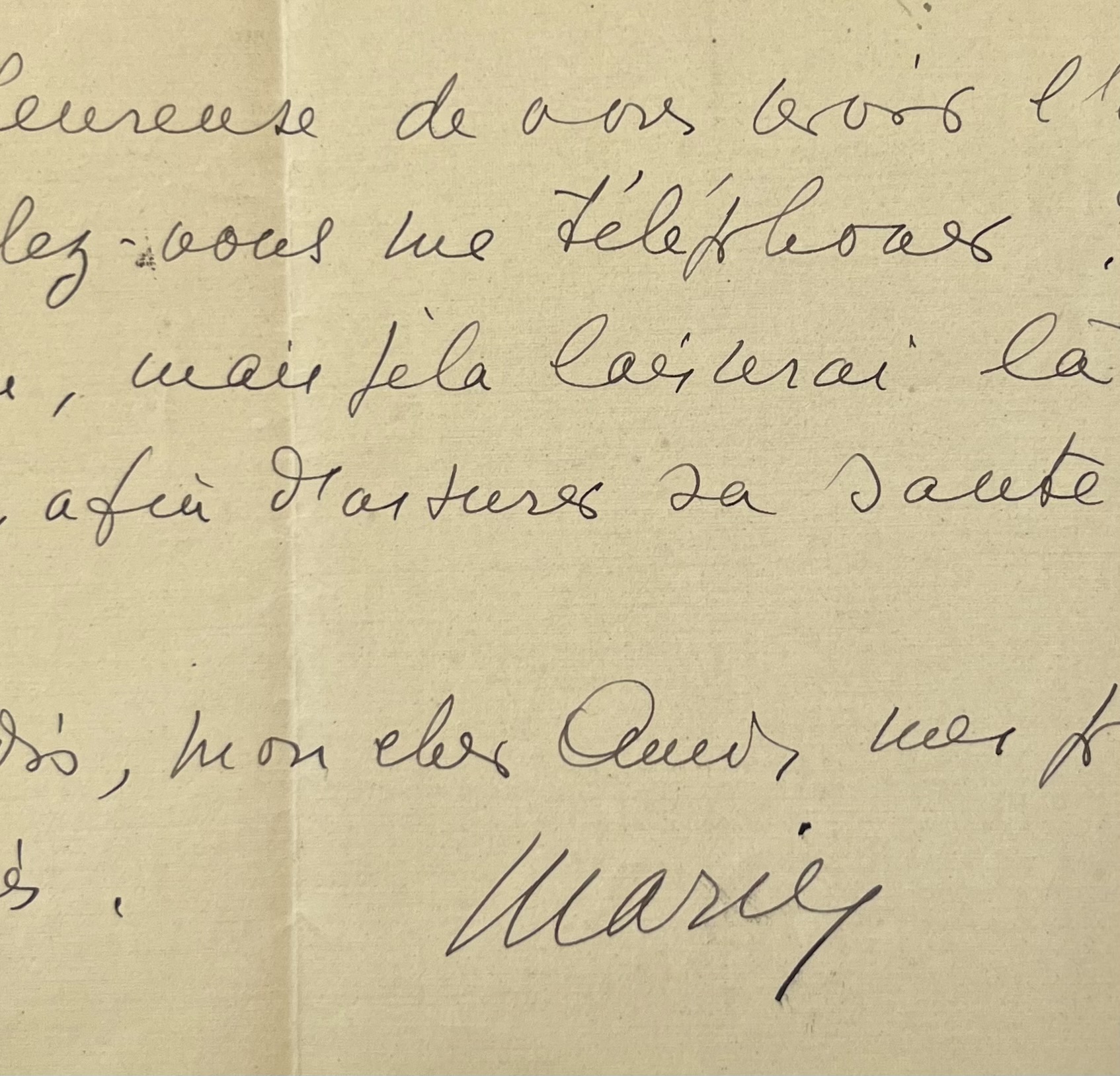 «Mon cher ami, votre lettre, que je viens de recevoir m’a semblé très touchante et je suis attristée de penser que vous ayez cru que je ne voulais plus ni vous écrire, ni vous voir ! Je n’ai pas reçu votre lettre du mois d’août, j’étais alors à Leysin ou au Semmering, suivant la date où vous l’avez envoyée, et parfois des lettres se perdent. Je serai certes heureuse de vous voir l’un de ces jours, voulez-vous me téléphoner ? Ma fille va bien, mais je la laisserai là-bas longtemps, afin d’assurer sa santé pour l’avenir. Et je vous redis, mon cher Ami, mes plus amicales pensées. Marie».